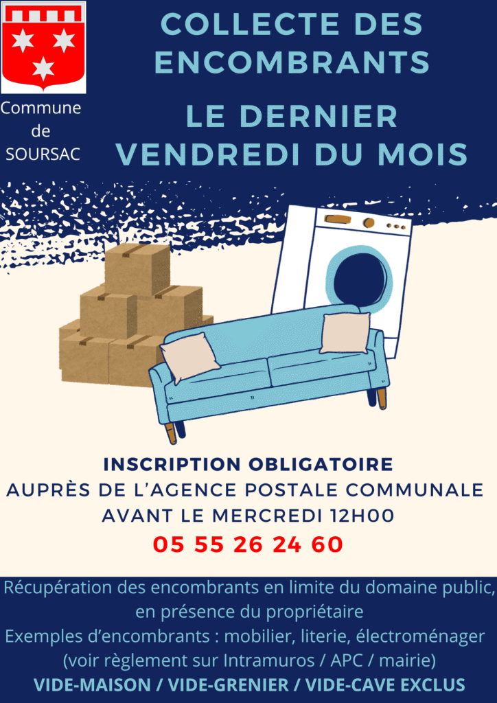 Tous les derniers vendredi du mois la mairie de Soursac vous propose un service gratuit de collecte des encombrants. Inscription à l’Agence Postale Communale avant le mercredi 12h.